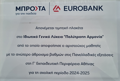 Τα εκπαιδευτήρια "Πολύτροπη Αρμονία" έχουν για 2η φορά την τιμή να βραβεύονται χάρη στην επίδοση τελειόφοιτης μαθήτριας στις Πανελλαδικές Εξετάσεις του 2025. Η Δήμητρα Κολιοφώτη συγκέντρωσε το ανώτερο άθροισμα βαθμών στην Γ’ Εκπαιδευτική Περιφέρεια Αθήνας για τη σχολική περίοδο 2024-2025.